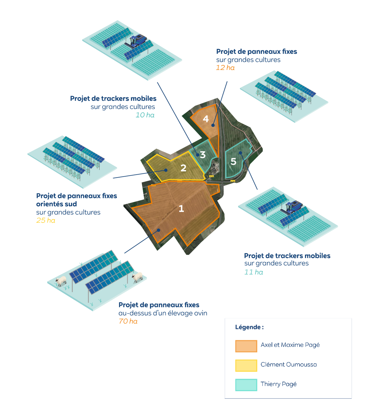 - Thierry Pagé maintiendra sur 18 hectares ses grandes cultures jusqu’à sa retraite. Les structures solaires protègeront ses cultures, et seront adaptées à de nombreux modes d’exploitation.